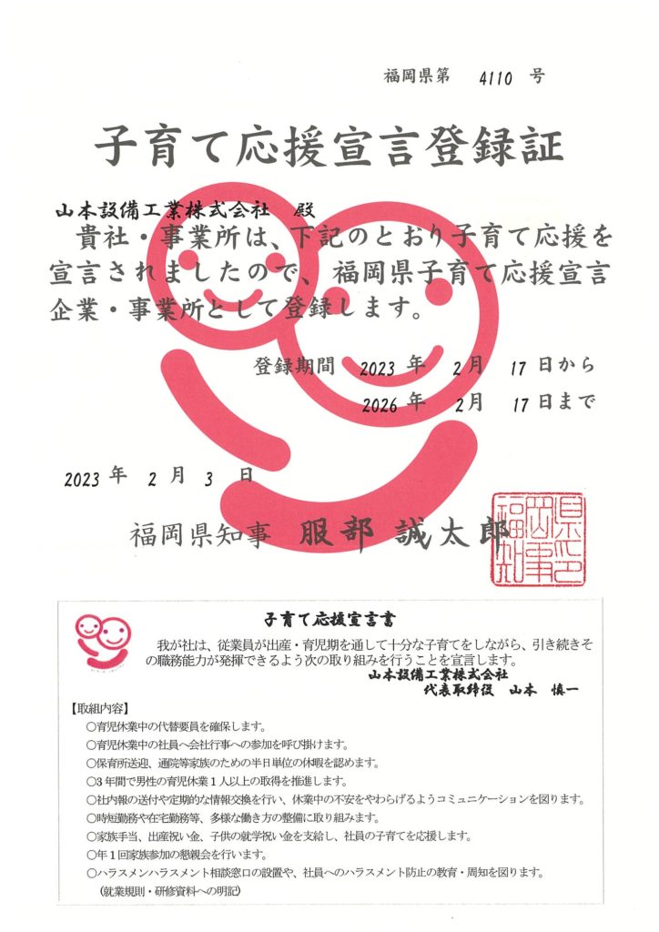 この度、福岡県の「子育て応援宣言企業登録制度」の更新を行いました。