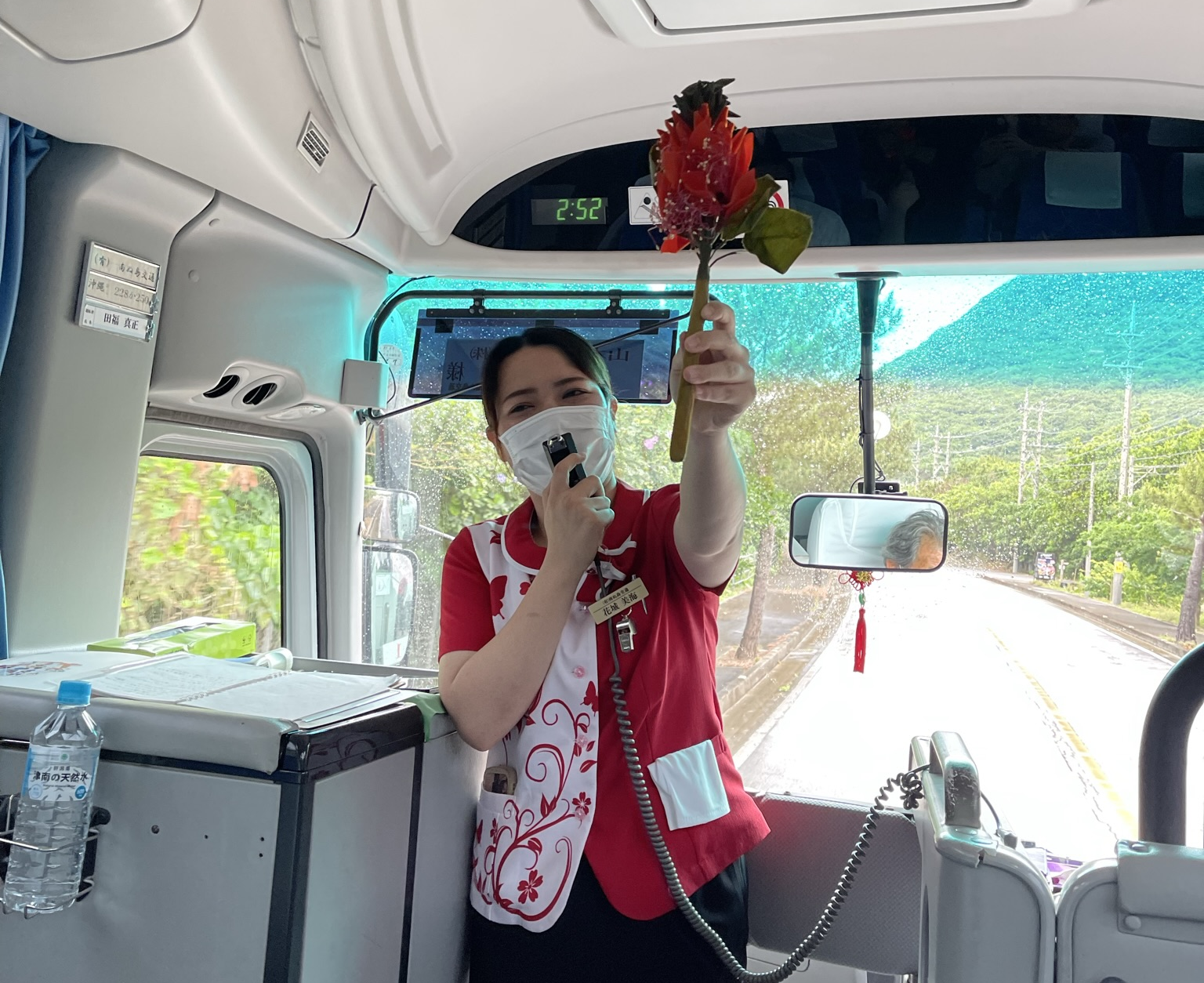 沖縄の県の花「デイゴ」を説明してくれるバスガイドさん。昨年の10月にバスガイドさんになったばかりだとか。 三線も披露してくれました。(がんばってください。福岡の地より応援してますっ。)