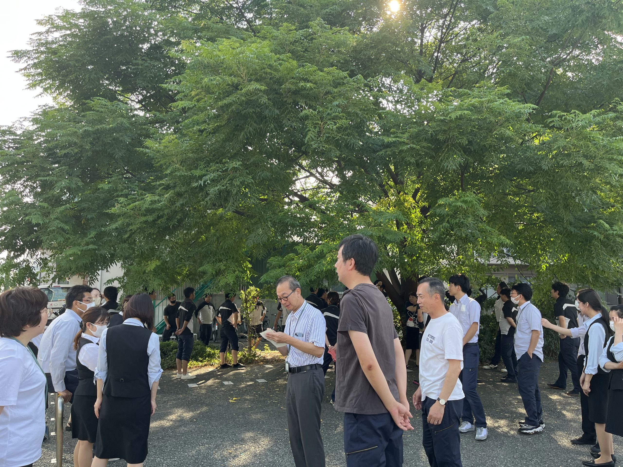 発火 → 非常ベル → 発火位置確認 → 初期消火 → 避難誘導 → 119番通等 の写真は撮影できなかったので、画像は避難場所(会社前の公園)に集合、人数確認している様子です。(ちなみにこの日は大掃除をした後だったので、みんなTシャツ着用だったり、ズボンの裾をまくり上げたりしています)