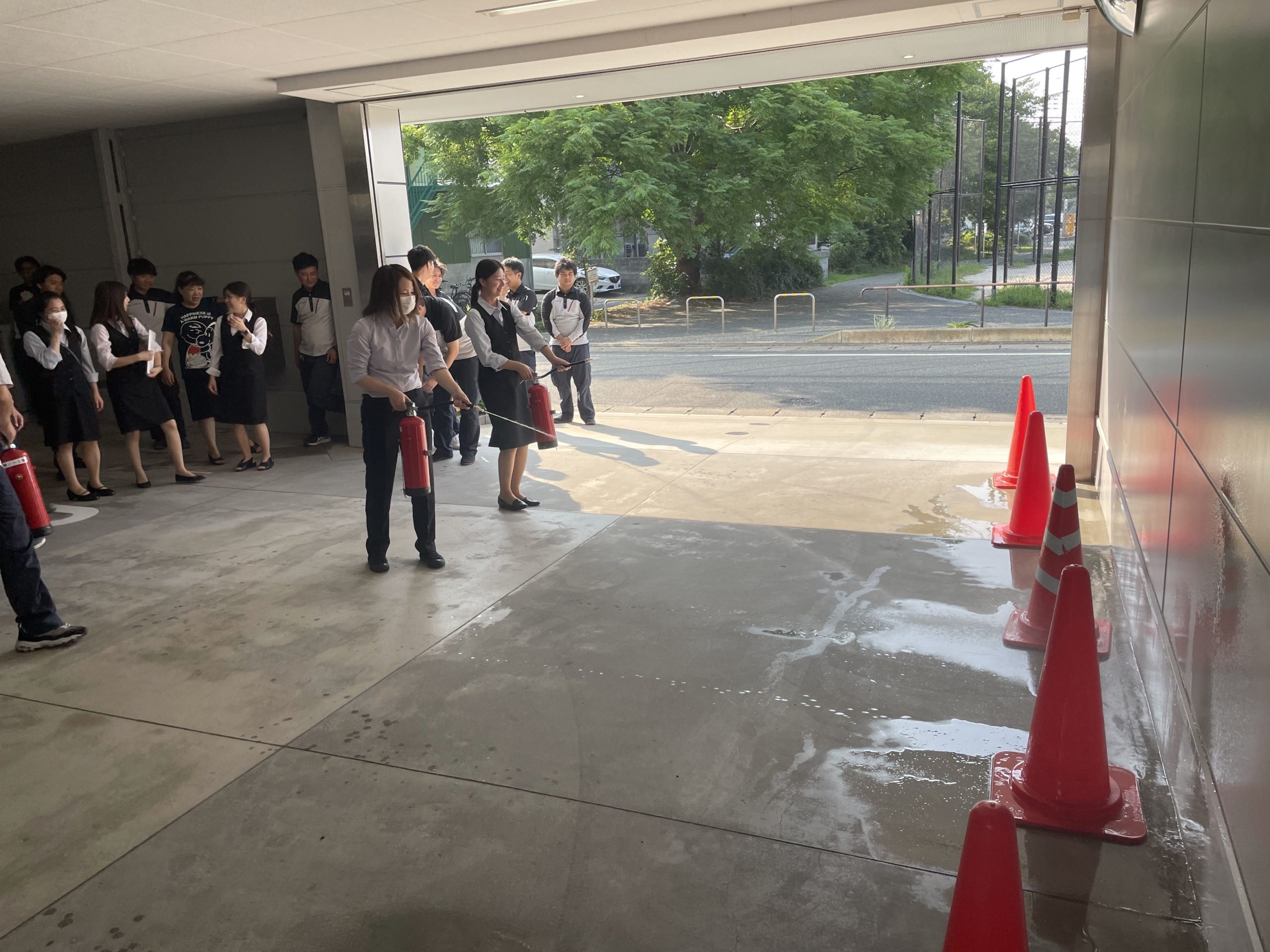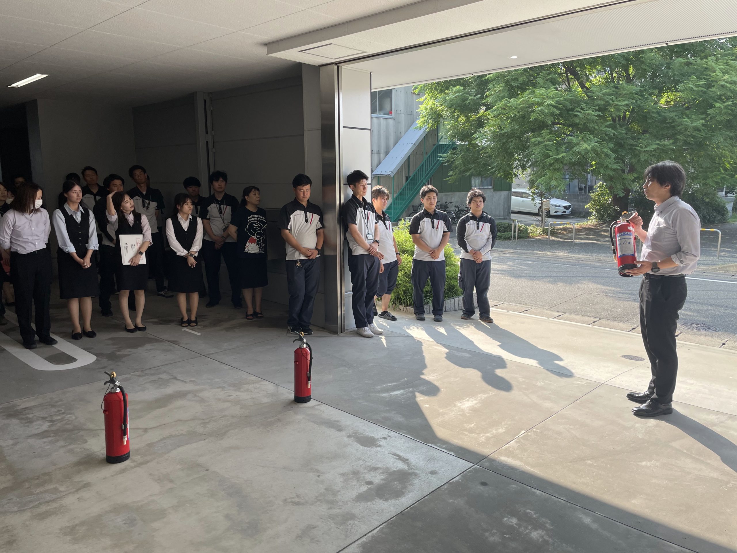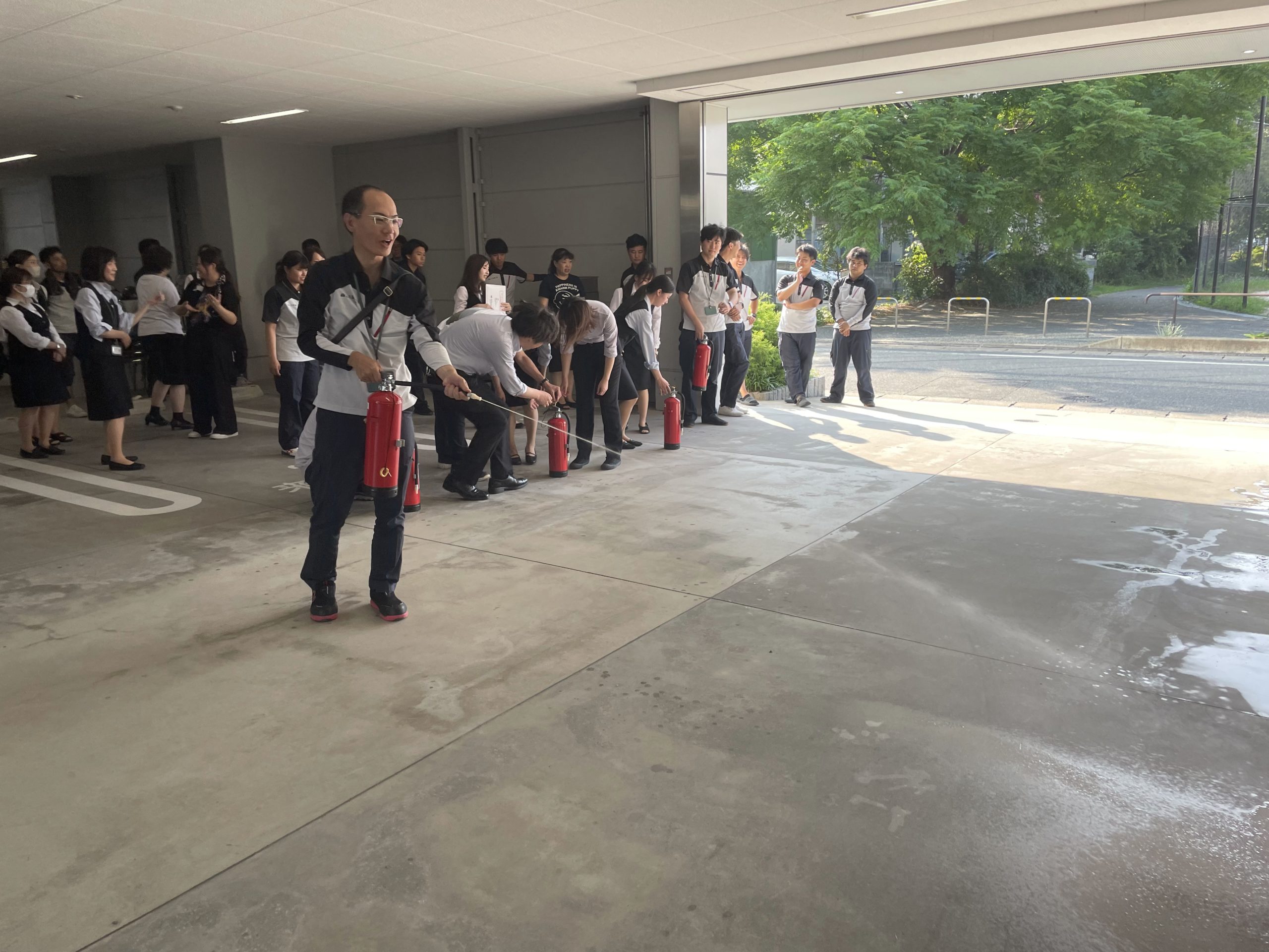 人数確認後、水消火器での消火訓練。 消防用設備の点検を行っていただいている会社の担当の方にお越しいただいて、説明を受けています。