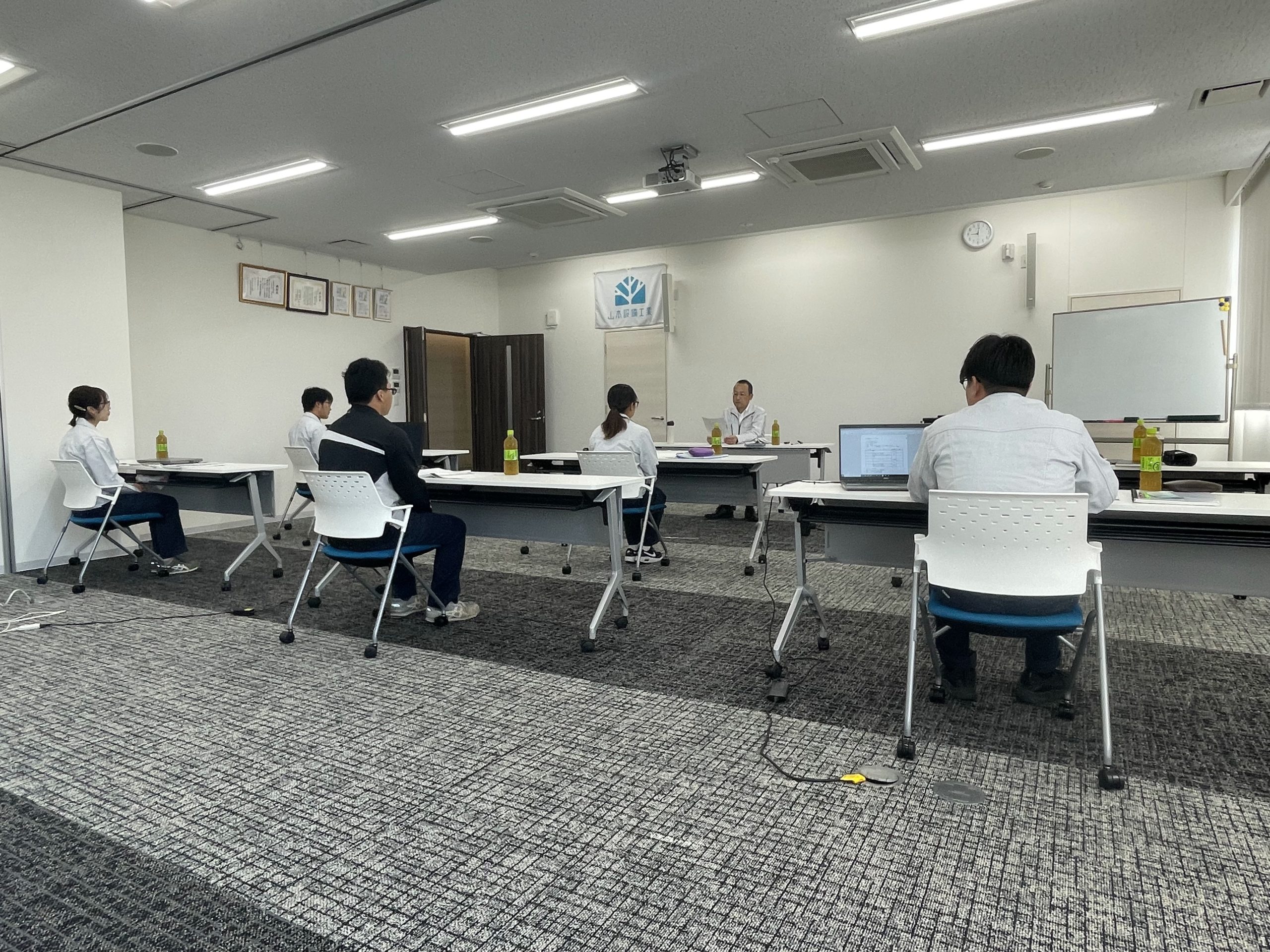 ・総務係長を講師に、「半年を振り返って」をテーマにディスカッションし、問題点などを同期で共有。 最後に、「感想文」「個人面談」を同時進行で行い、終了。