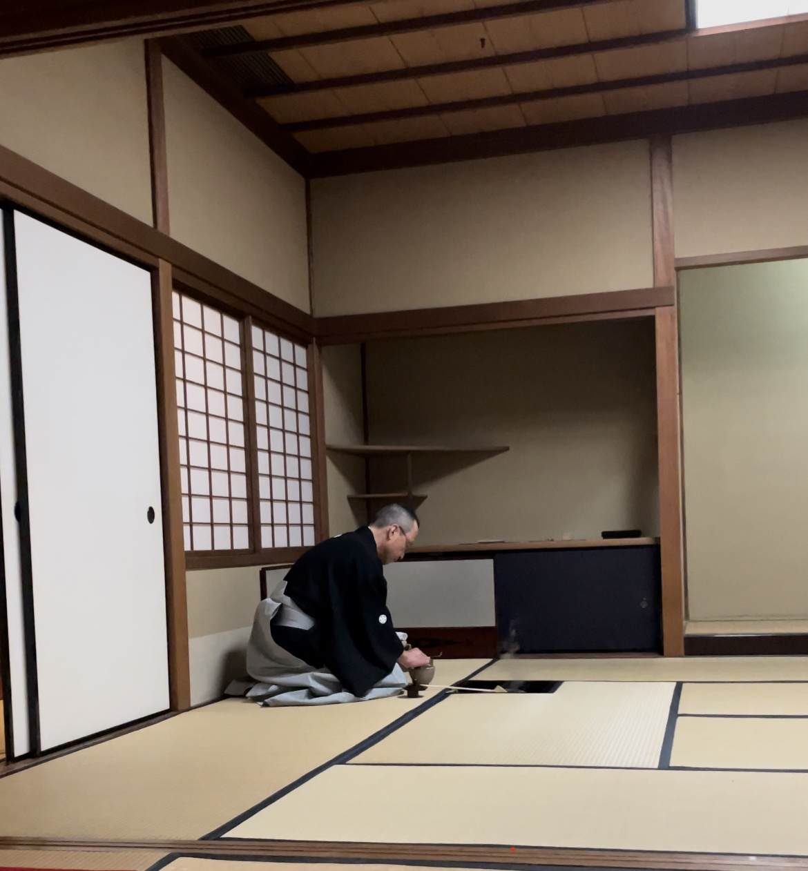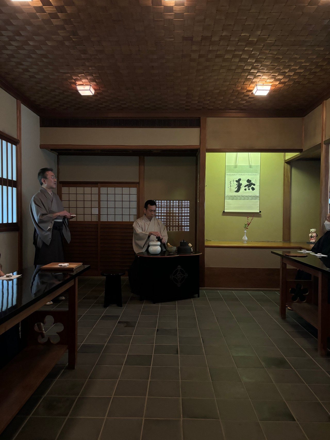 続いて、濃茶。 濃茶席では、山本社長が実際にお茶を練ってくださいました。 山本社長の着物でお茶を練る姿はとても素敵でした。 濃茶は薄茶と違って『点てる』ではなく、『練る』だそうで、実際にいただいたお茶もドロドロしてました。 とても美味しかったです(⌒∇⌒)